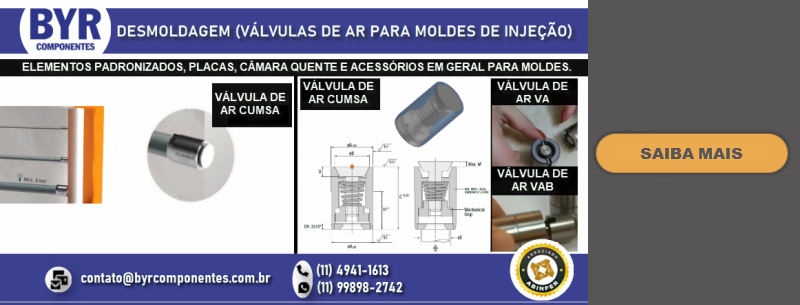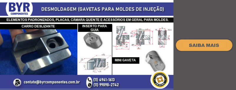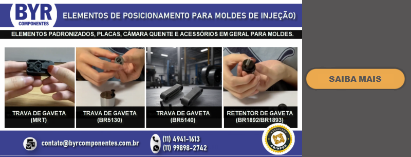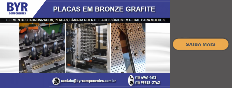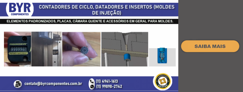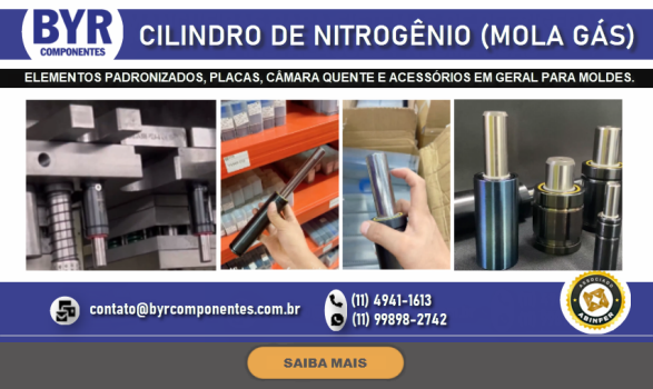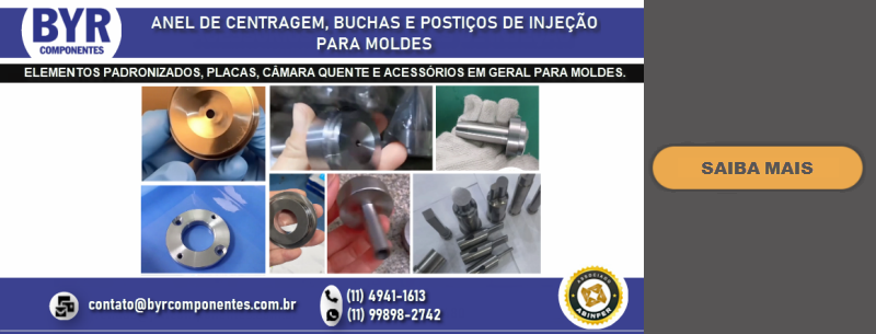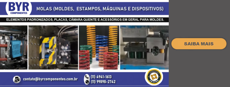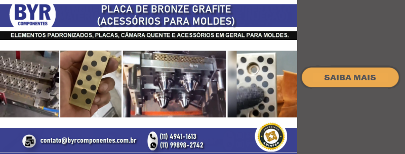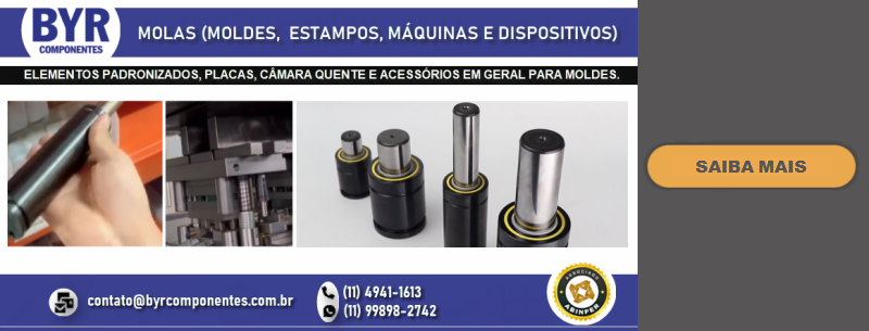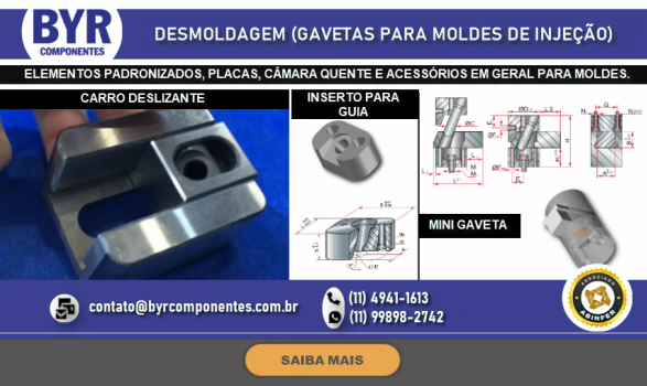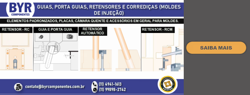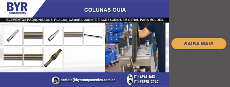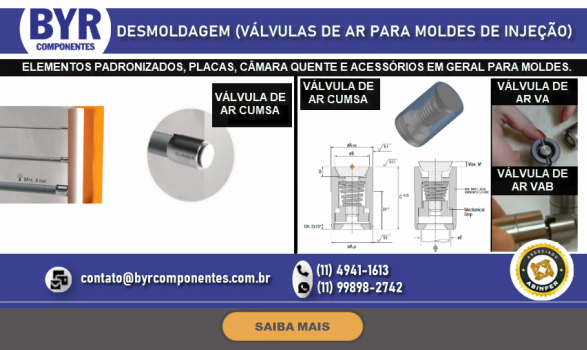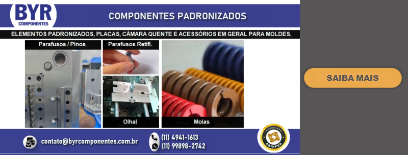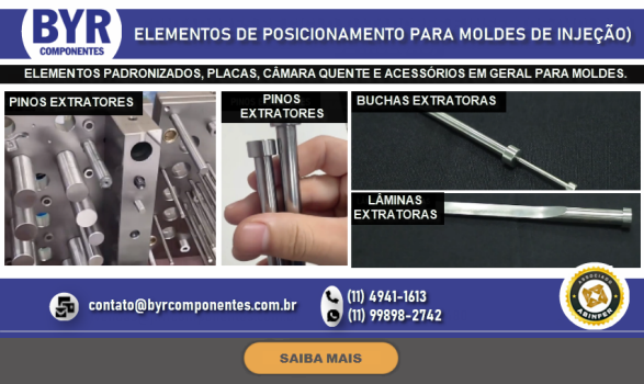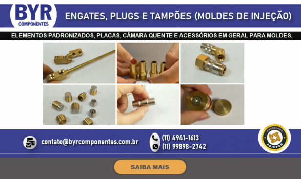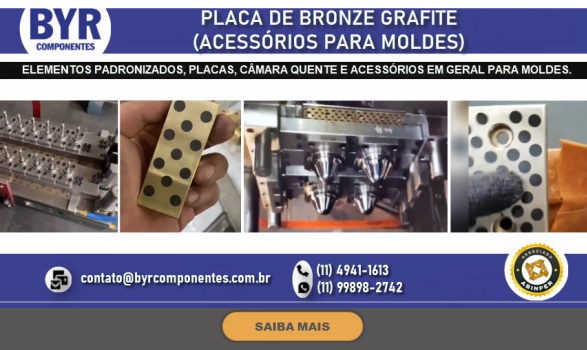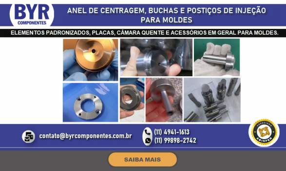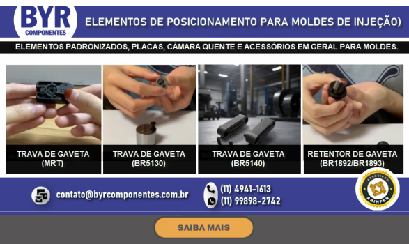 FUNDADA EM 1962, A BRU Y RUBIO, ATRAVÉS DE SUA SUBSIDIÁRIA BRASILEIRA A BYR COMPONENTES (SÃO BERNARDO DO CAMPO – SP), OFERECE NO BRASIL UMA LINHA DIVERSIFICADA DE COMPONENTES PADRONIZADOS PARA MOLDES E ESTAMPOS, DENTRE ELES PLACAS DE PORTA MOLDES, GUIAS, EXTRATORES DIVERSOS, CENTRALIZADORES, VÁLVULAS DE AR, DATADORES, ELEMENTOS DE TRAVAMENTO, PLUGS E ENGATES DE REFRIGERAÇÃO, PLACAS DE ISOLAÇÃO TÉRMICA, PLACAS E PERFIS DE BRONZE COM INSERTO ANTI-ATRITO, CONTADORES E MUITO MAIS